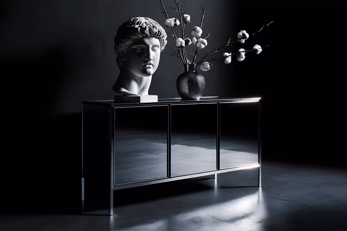 Kit di vernici per superfici in legno che riproduce l’effetto specchiato cromato mirror. Finitura a specchio ultra-lucida, riflettente e di lusso.